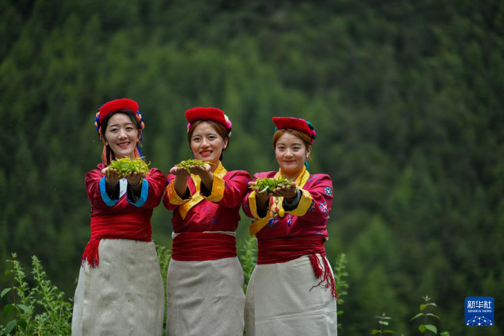 尼瑪卓瑪(左)與村民們在展示采摘到的莓茶(7月29日攝)。新華社記者 旦增尼瑪曲珠 攝