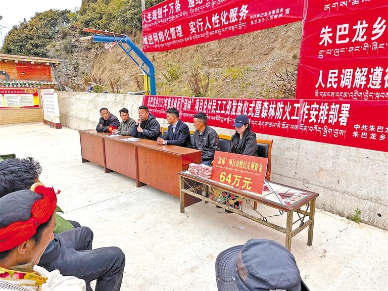 圖為發(fā)放農(nóng)牧民群眾工資現(xiàn)場。記者 索朗旺久 攝