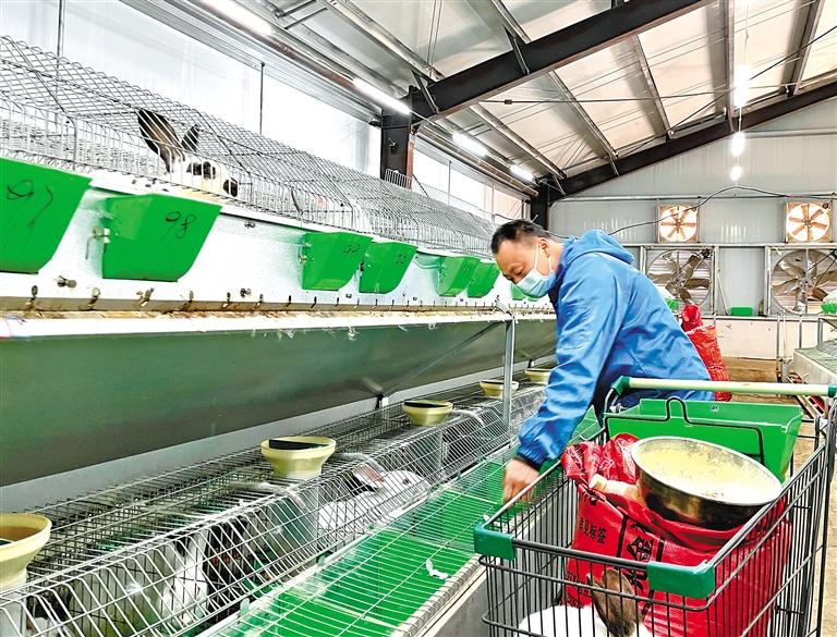 圖為拉薩市曲水縣才納鄉(xiāng)四季吉祥村獺兔養(yǎng)殖場的工人給兔子喂料。 記者 旦增蘭澤 攝