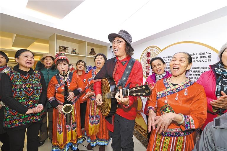 “蟠龍社區(qū)生活著漢族、壯族、瑤族等15個(gè)民族的同胞,少數(shù)民族人口約占社區(qū)總?cè)丝诘?/3?!斌待埳鐓^(qū)黨委副書(shū)記許玉君介紹說(shuō),社區(qū)結(jié)合多民族“嵌入式”居住的特點(diǎn),創(chuàng)新踐行“136”工作機(jī)制,即圍繞鑄牢中華民族共同體意識(shí)這條主線,通過(guò)加強(qiáng)黨的領(lǐng)導(dǎo)、織牢精神紐帶、用好治理平臺(tái)“三個(gè)抓手”,積極創(chuàng)造各民族共居共學(xué)、共建共享、共事共樂(lè)的“六共”條件,讓各族群眾像石榴籽一樣緊緊抱在一起?!拔沂菨h族,會(huì)做壯族的特色菜,我愛(ài)人是仫佬族,漢字書(shū)法練得有模有樣?!斌待埳鐓^(qū)藝術(shù)團(tuán)骨干何繼榮老人說(shuō)。