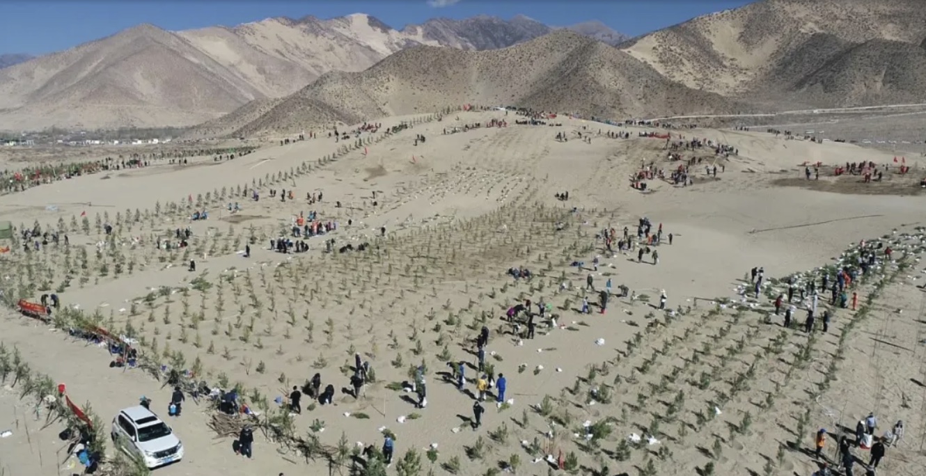 彼時的雅江中游河畔是一片土地沙化嚴(yán)重、風(fēng)沙肆虐的荒蕪之地。據(jù)原山南地區(qū)林業(yè)局局長李純祿回憶:離江較近的農(nóng)田風(fēng)蝕嚴(yán)重,有的地塊一年要重播兩三次。附近草場沙化嚴(yán)重。有時沙塵暴卷起的揚(yáng)沙達(dá)數(shù)十米甚至數(shù)百米之高,遮天蔽日,天昏地暗。