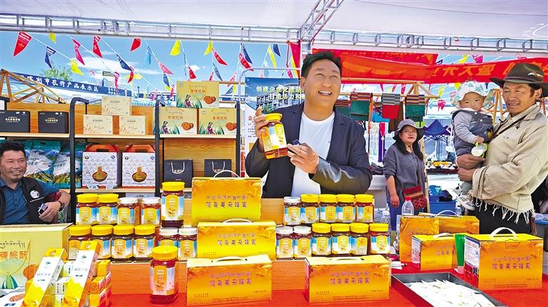 圖為在日喀則高原農(nóng)特產(chǎn)品及尼泊爾特色產(chǎn)品展示展銷活動(dòng)上,商家在展示自家產(chǎn)品。