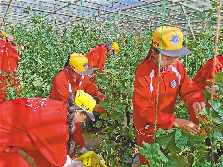 鞍山市援建的巴青縣中學勤工儉學實踐基地內(nèi),學生在采摘。