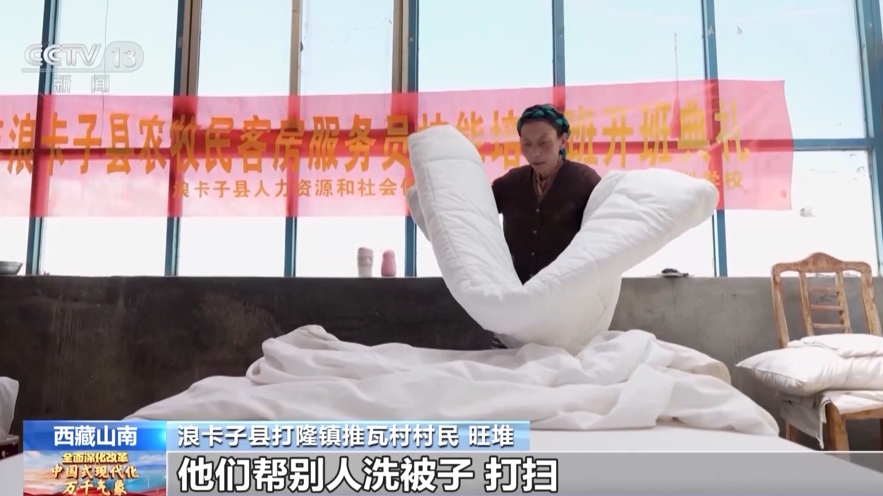 旺堆:村民有這樣的觀念,他們幫別人洗被子、打掃,他們都不愿意,他們?cè)嚵艘院螅麄円荒昀锩娴玫搅?5000元的收入,慢慢他們把傳統(tǒng)的觀念放下了。