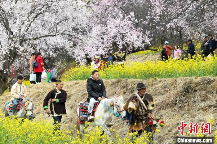 圖為2024年3月31日林芝桃花節(jié)期間,嘎拉村村民帶領(lǐng)游客騎馬賞花。貢嘎來(lái)松 攝