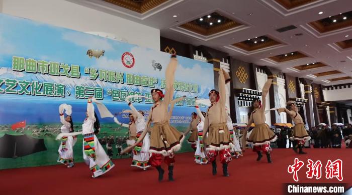 圖為班戈縣“鄉(xiāng)村振興 那曲奮進(jìn)”活動(dòng)成果轉(zhuǎn)化暨文藝文化展演、第三屆畜產(chǎn)品展銷(xiāo)會(huì)開(kāi)幕式歌舞演出。洛桑斯卓 攝