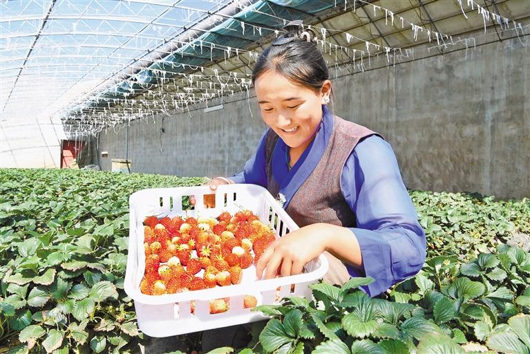 圖為拉薩市尼木縣吞彌現(xiàn)代農(nóng)業(yè)產(chǎn)業(yè)園區(qū)草莓大棚內(nèi),工作人員在采摘草莓。記者 洛桑 王敏 攝