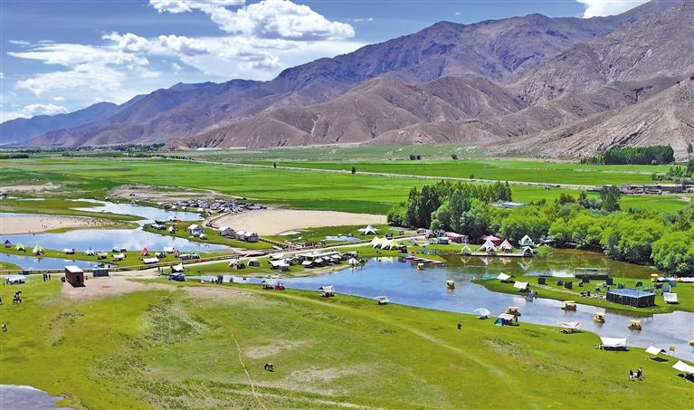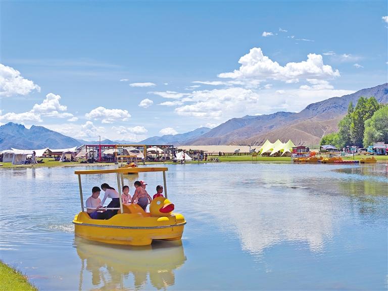 楚貴林卡位于日喀則市桑珠孜區(qū)東嘎鄉(xiāng)楚貴村。2019年初,青島援藏組規(guī)劃盤活村集體用地,打造以自然生態(tài)景觀、休閑度假旅游及異域農(nóng)耕民俗文化體驗(yàn)為主題,融合當(dāng)?shù)匚幕瘍?nèi)涵的“楚貴村生態(tài)旅游度假區(qū)”項(xiàng)目。項(xiàng)目自2022年啟動(dòng)以來,隨著運(yùn)營(yíng)漸趨成熟,林卡休閑游樂設(shè)施逐年豐富。如今,這里設(shè)有咖啡休閑館、山地摩托、真人CS、游船、騎馬等多個(gè)傳統(tǒng)與現(xiàn)代結(jié)合的項(xiàng)目,受到游客青睞。