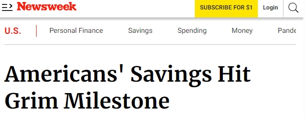 美國富國銀行(Wells Fargo)分享給《新聞周刊》(Newsweek)的一份分析報告顯示,美國人的儲蓄速度正在下降,達(dá)到一年多來的最低水平。與此同時,另一項調(diào)查指出,近38%的美國人不得不動用儲蓄或求助家人朋友以應(yīng)對日常支出。有超過半數(shù)的美國人認(rèn)為通脹是美國當(dāng)前面臨的一個比移民和犯罪等更大的問題。