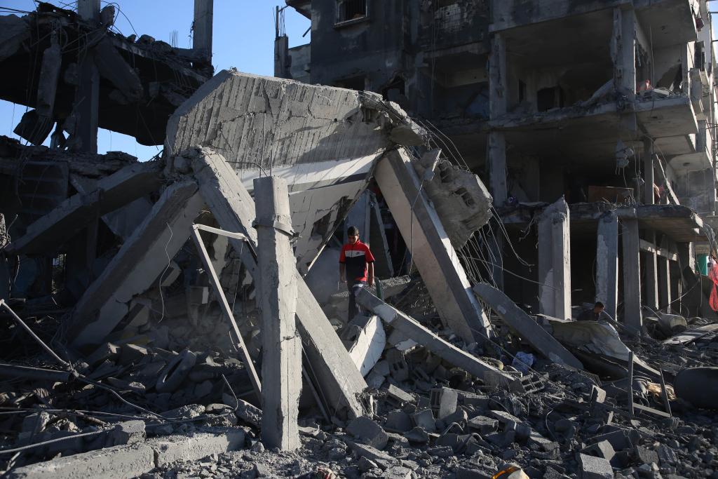 4月20日,在加沙地帶南部城市拉法,巴勒斯坦人查看被以軍空襲的建筑。新華社發(fā)(哈立德·奧馬爾攝)