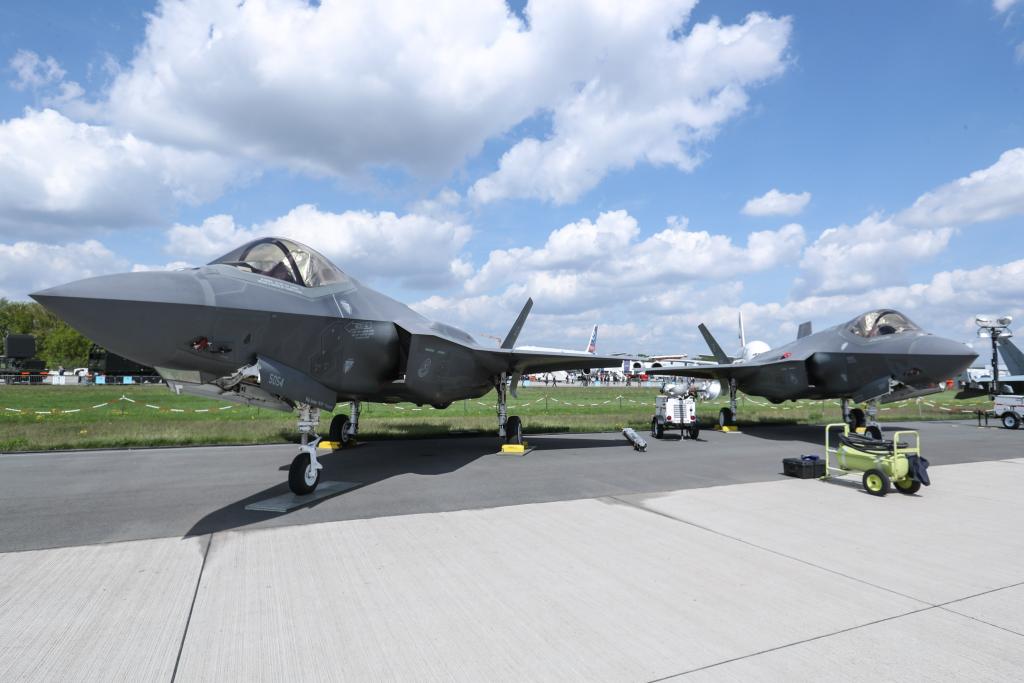 這是2018年4月27日在德國(guó)柏林國(guó)際航空航天展上拍攝的“F-35”型戰(zhàn)機(jī)。新華社記者單宇琦攝