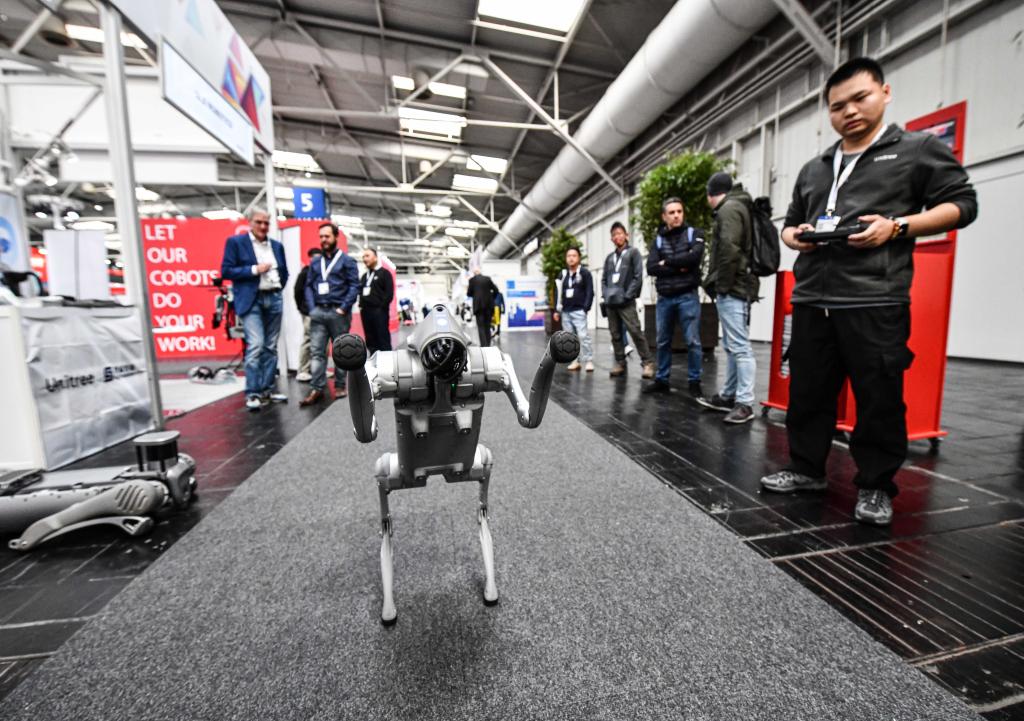 4月22日,在德國(guó)漢諾威工博會(huì)上,杭州宇樹科技有限公司參展商(右一)在展示一款機(jī)器狗。新華社記者任鵬飛攝