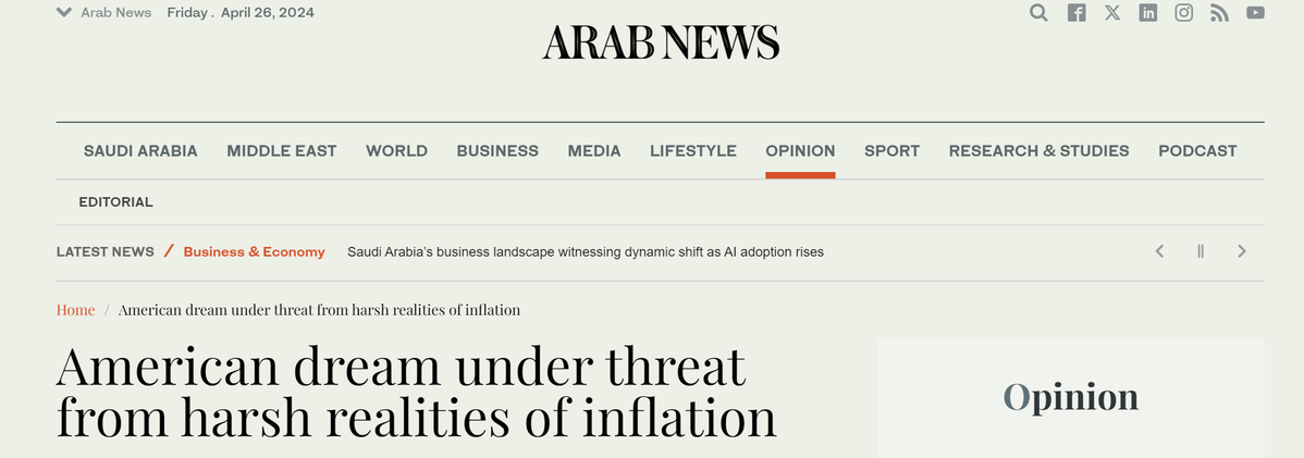 沙特阿拉伯媒體《阿拉伯新聞》網(wǎng)站4月24日刊發(fā)評論文章稱,美國通脹高企,物價不斷上漲,導(dǎo)致民眾的購買力持續(xù)下降,基本生活消費品成為無力負擔(dān)的“奢侈品”。“美國夢”被殘酷的現(xiàn)實擊潰。文章批評美國政府對通脹危機的反應(yīng)嚴重不足,將黨派問題置于解決民眾的迫切需求之上,削弱了民眾的信任感。