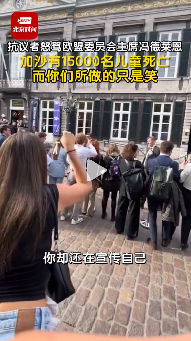 抗議者怒罵歐盟委員會(huì)主席馮德萊恩:加沙有15000名兒童死亡 而你們所做的只是笑