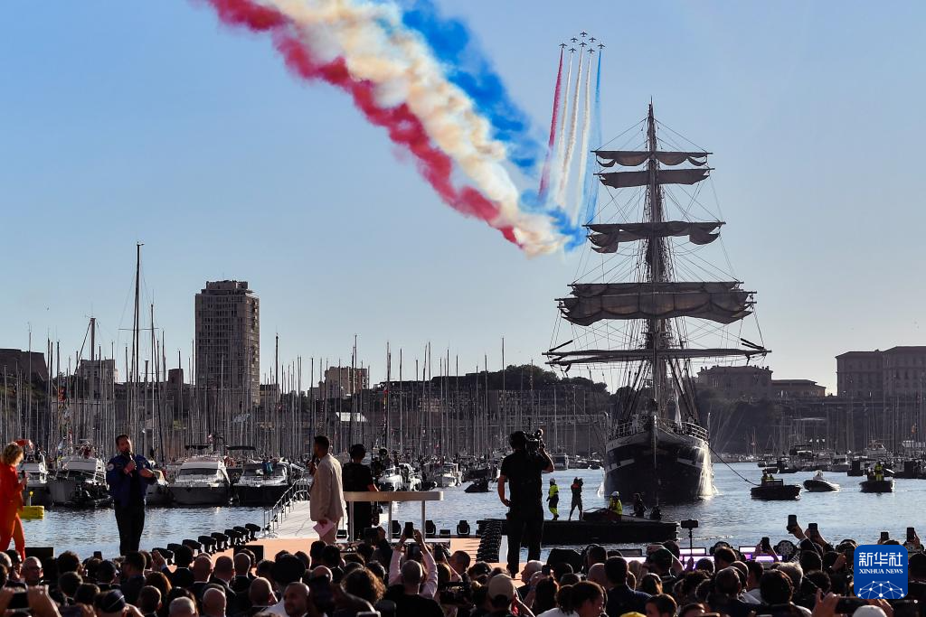 ??傍晚時分,伴隨著現(xiàn)場觀眾高唱法國國歌《馬賽曲》,“貝勒姆”號緩緩駛進港口,著名的“法蘭西巡邏兵”飛行表演隊從港口上空呼嘯而過,先后展示了奧運五環(huán)與法國國旗的圖案。