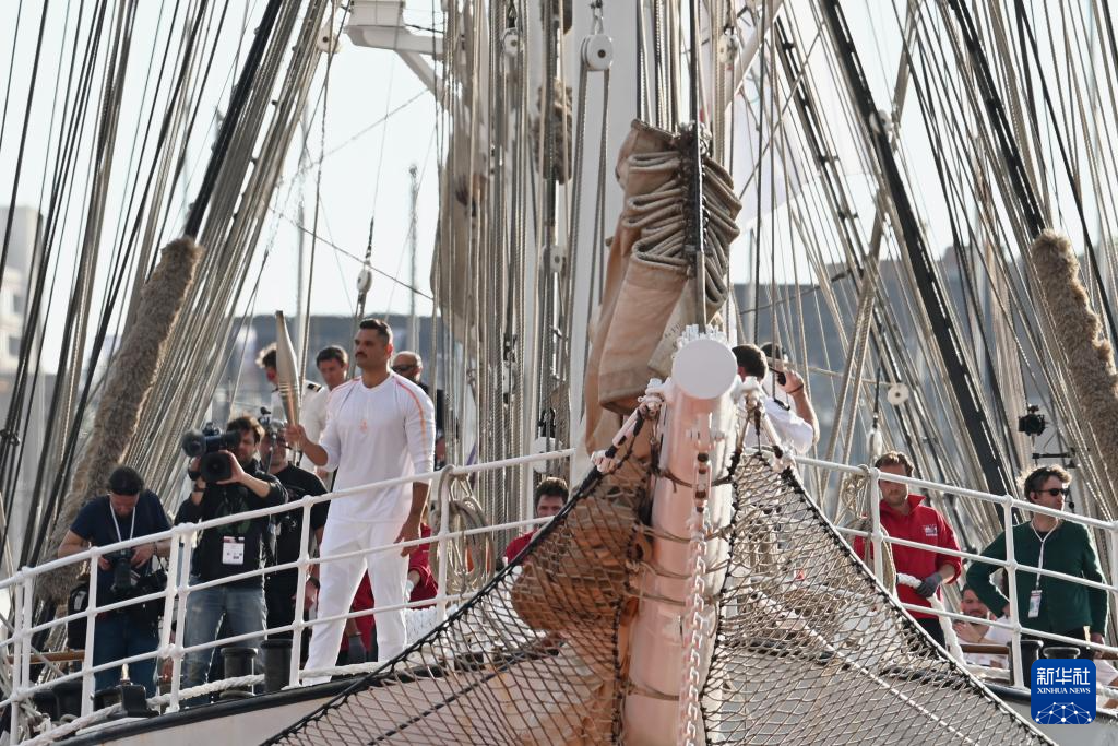 ??在“貝勒姆”號靠岸后,馬賽交響樂團開始演奏巴黎奧運會主題曲《巡游盛典》。約19時30分,2012年倫敦奧運會游泳冠軍弗洛朗·馬諾杜作為在法國本土的第一棒火炬手,手持火炬從“貝勒姆”號上走下,象征著奧運火種正式登陸法國。