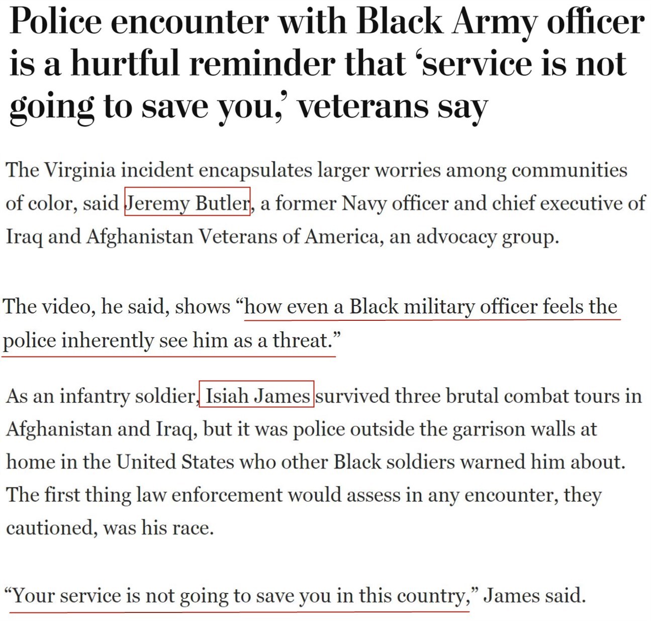 在美國伊拉克和阿富汗退役軍人協(xié)會(huì)首席執(zhí)行官杰里米·巴特勒看來,納扎里奧事件表明,“即使是一名非裔軍官也會(huì)覺得,美國警察天生就把他視為一種威脅”。