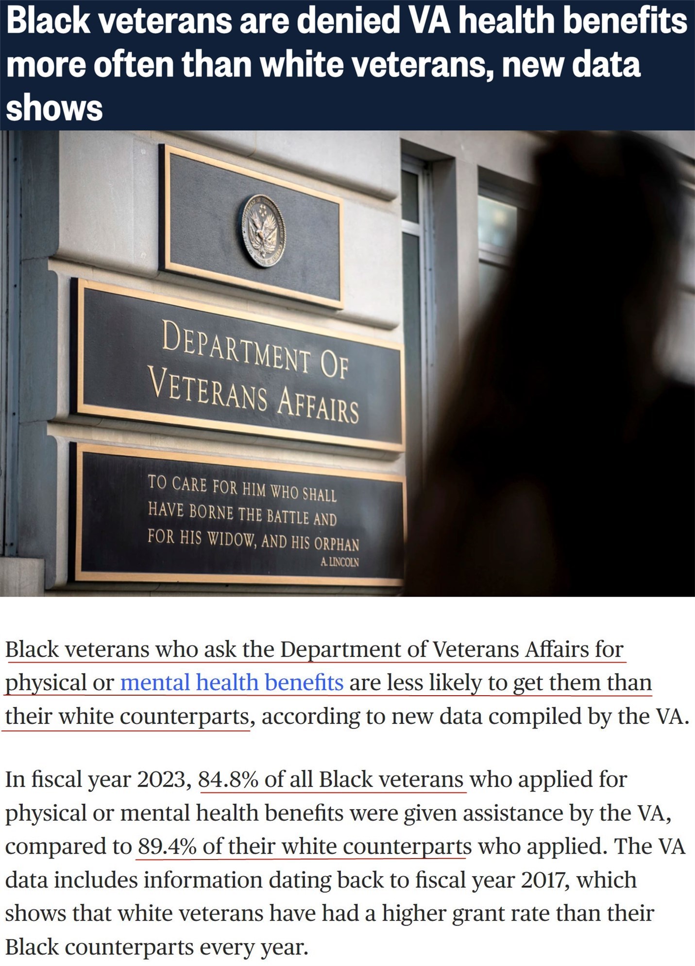 △美國全國廣播公司網(wǎng)站:在2023財(cái)年,申請身心健康福利的所有非裔退役軍人中有84.8%獲得了退役軍人事務(wù)部的援助,而白人退役軍人的這一比例為89.4%。