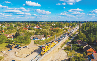 在匈塞鐵路項(xiàng)目現(xiàn)場(chǎng),鋪軌機(jī)正在塞爾維亞邊境的蘇博蒂察進(jìn)行鋪軌作業(yè)。