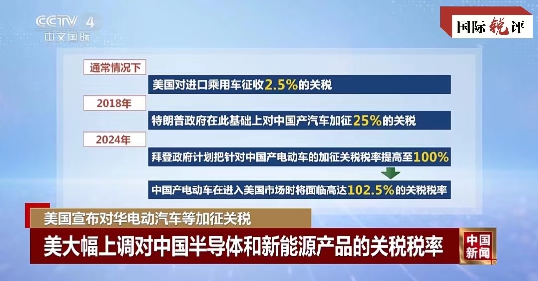 這其中,對(duì)中國電動(dòng)汽車加征的進(jìn)口關(guān)稅令人瞠目——從27.5%升至102.5%,對(duì)太陽能電池的進(jìn)口稅從25%提高到50%,對(duì)鋰電池的關(guān)稅稅率從7.5%提高到25%。不難看出,美國政府此次針對(duì)的重點(diǎn)是中國新能源相關(guān)產(chǎn)業(yè)。難怪美國多名高官近期密集炒作所謂中國新能源“產(chǎn)能過剩”,不過是為加征關(guān)稅制造借口。