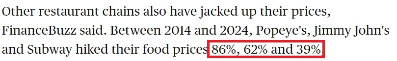 美國哥倫比亞廣播公司網(wǎng)站: 2014年至2024年間,“大力水手”“吉米·約翰”和“賽百味”的產(chǎn)品價格分別上漲了86%、62%和39%。