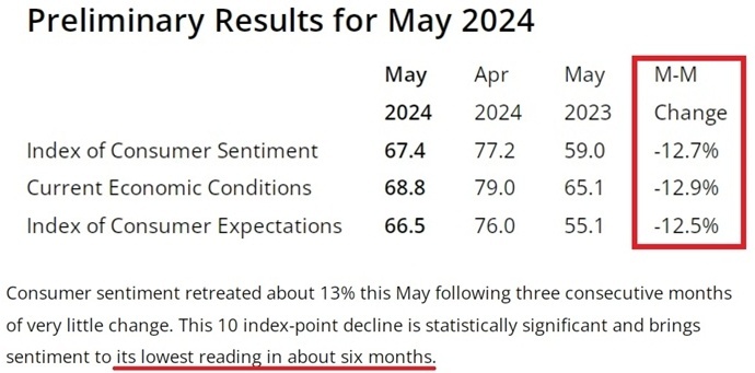 密歇根大學(xué)的最新調(diào)查顯示,由于預(yù)期通脹率和利率都將維持在高位,美國5月消費者信心指數(shù)(CSI)在連續(xù)三個月幾乎持平后較上月大幅回落了約13%,降至約半年來的最低水平。
