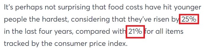事實上,“食品通脹率”已經(jīng)超過了整體通脹率:過去四年,食品價格上漲了25%,而所有商品的價格平均漲幅為21%。