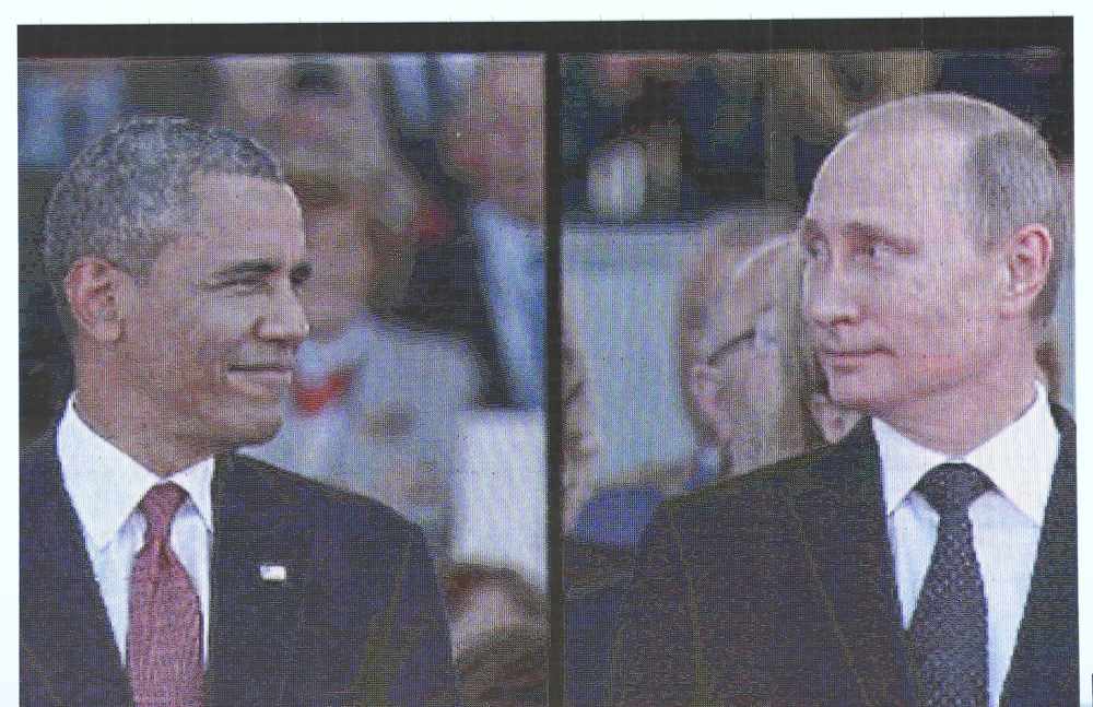 2014年6月6日,在法國(guó)諾曼底地區(qū)烏伊斯特勒昂,大屏幕播放前來(lái)參加諾曼底登陸70周年紀(jì)念儀式的俄羅斯總統(tǒng)普京(右)和美國(guó)總統(tǒng)奧巴馬(左)的影像。新華社/路透