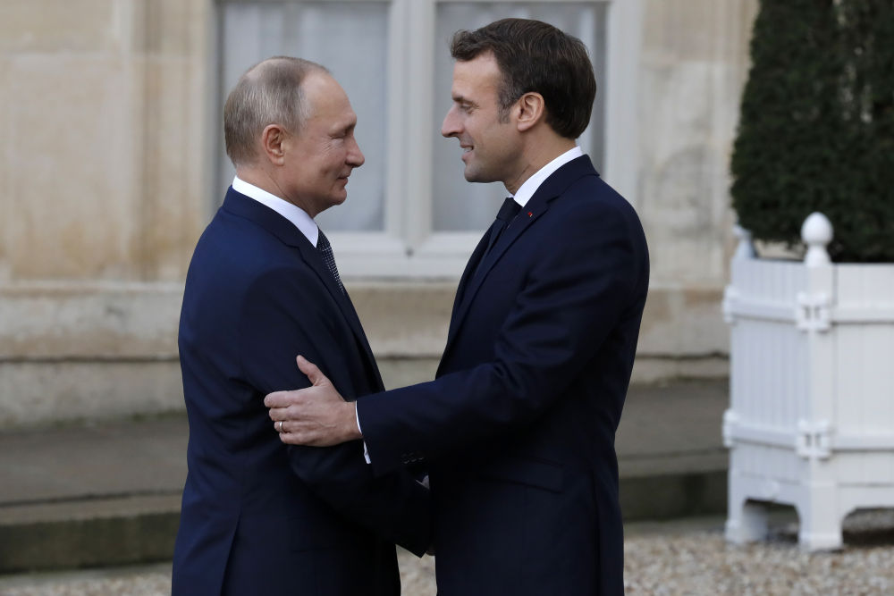 2019年12月9日,在法國(guó)巴黎,法國(guó)總統(tǒng)馬克龍(右)迎接前來(lái)參加“諾曼底模式”四國(guó)峰會(huì)的俄羅斯總統(tǒng)普京。新華社發(fā)(杰克·陳攝)