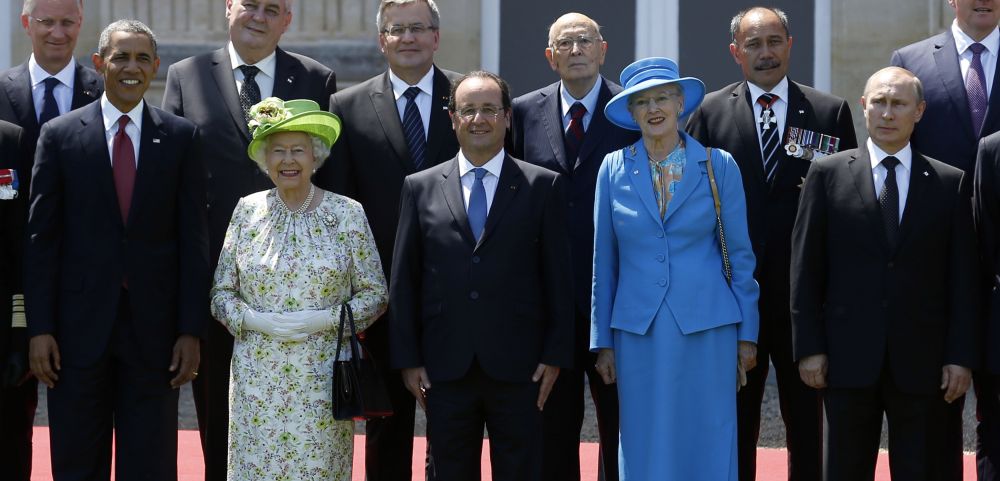 2014年6月6日,在法國(guó)貝努維爾,前來(lái)參加諾曼底登陸70周年紀(jì)念儀式的(前排左起)美國(guó)總統(tǒng)奧巴馬、英國(guó)女王伊麗莎白二世、法國(guó)總統(tǒng)奧朗德、丹麥女王瑪格麗特二世、俄羅斯總統(tǒng)普京等嘉賓合影。新華社/路透