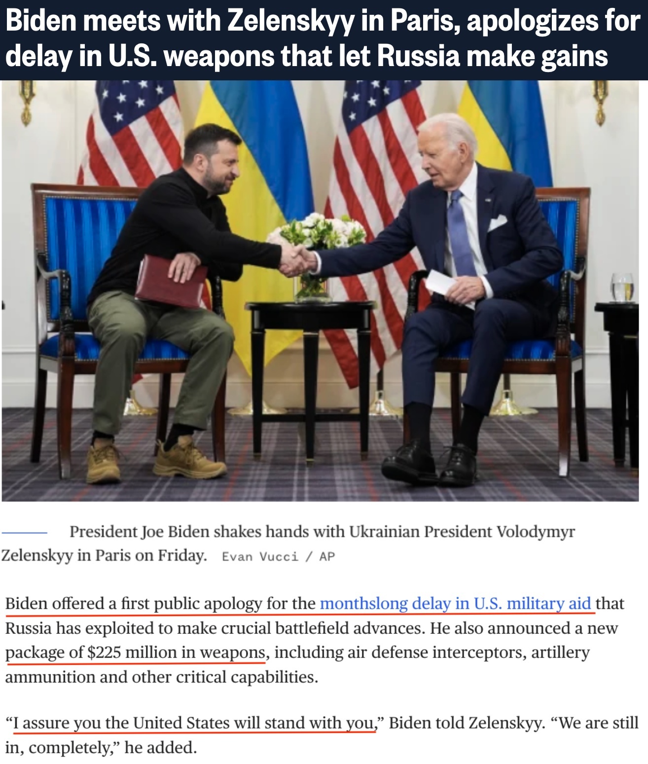 在巴黎會(huì)見烏克蘭總統(tǒng)澤連斯基時(shí),拜登首次就美國(guó)國(guó)會(huì)未能更早通過(guò)對(duì)烏新援助法案“道歉”,并宣布將再向?yàn)蹩颂m提供2.25億美元援助。