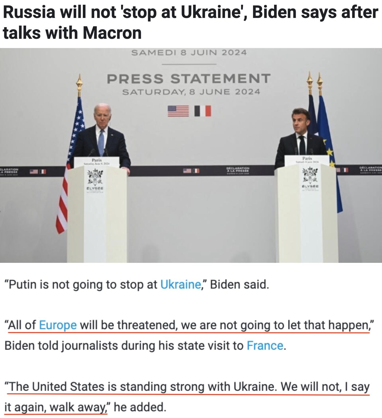 “俄羅斯不會(huì)止步于烏克蘭,整個(gè)歐洲都將受到威脅,我們不會(huì)讓這種情況發(fā)生……美國(guó)堅(jiān)定地支持烏克蘭。我再說(shuō)一遍,我們不會(huì)走開?!?/p>