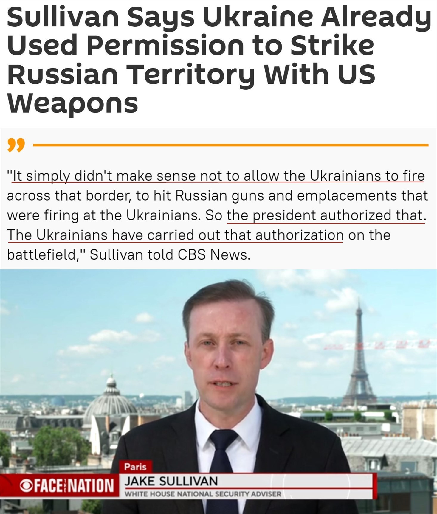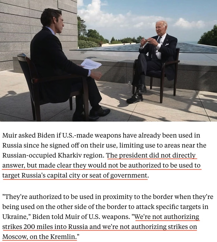 “它們(這些武器)被授權(quán)在(烏俄)邊境附近使用……我們沒(méi)有授權(quán)(烏克蘭)向俄羅斯境內(nèi)200英里(約合320公里)的地方發(fā)動(dòng)襲擊,也沒(méi)有授權(quán)對(duì)莫斯科、克里姆林宮進(jìn)行打擊。”