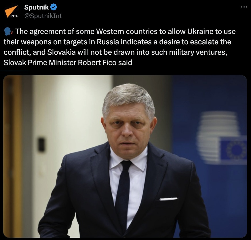 斯洛伐克總理菲佐日前也表示,西方國(guó)家允許烏克蘭使用西方武器襲擊俄羅斯本土目標(biāo),只能證明它們想要的不是和平,而是它們與俄羅斯緊張關(guān)系的升級(jí),斯洛伐克不會(huì)被拉入這樣的軍事冒險(xiǎn)。