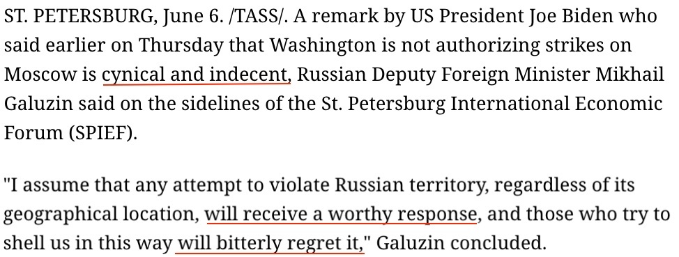 對(duì)此,俄羅斯副外長(zhǎng)加盧津回應(yīng)稱,拜登關(guān)于可以襲擊俄邊境地區(qū)、但不能襲擊莫斯科和克里姆林宮的表態(tài)是“卑鄙且失禮”的。