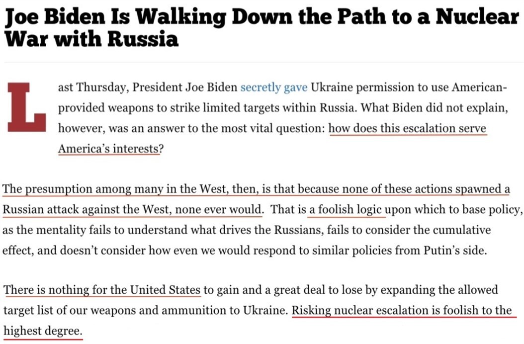 文章認(rèn)為,允許烏克蘭擴(kuò)大美援武器的打擊范圍對(duì)美國(guó)有百害而無(wú)一利。在美國(guó)安全并未受到威脅的情況下,冒險(xiǎn)與俄羅斯爆發(fā)核戰(zhàn)爭(zhēng)簡(jiǎn)直“蠢透了”。