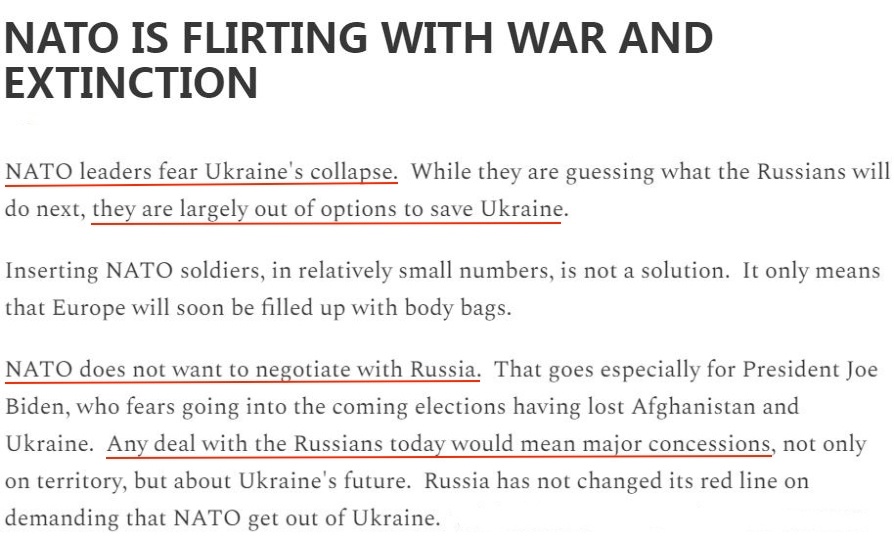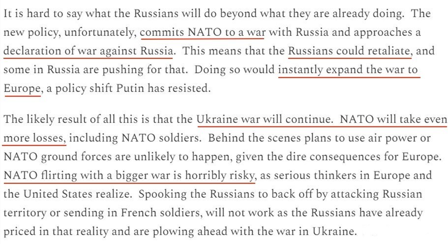 文章警告,美國(guó)等國(guó)家放寬援烏武器使用限制的新政策在事實(shí)上將北約拉進(jìn)了與俄羅斯的沖突中,并且已經(jīng)接近于對(duì)俄宣戰(zhàn)。這將導(dǎo)致俄烏沖突無(wú)限期繼續(xù)下去,最終令北約自身蒙受更多損失。