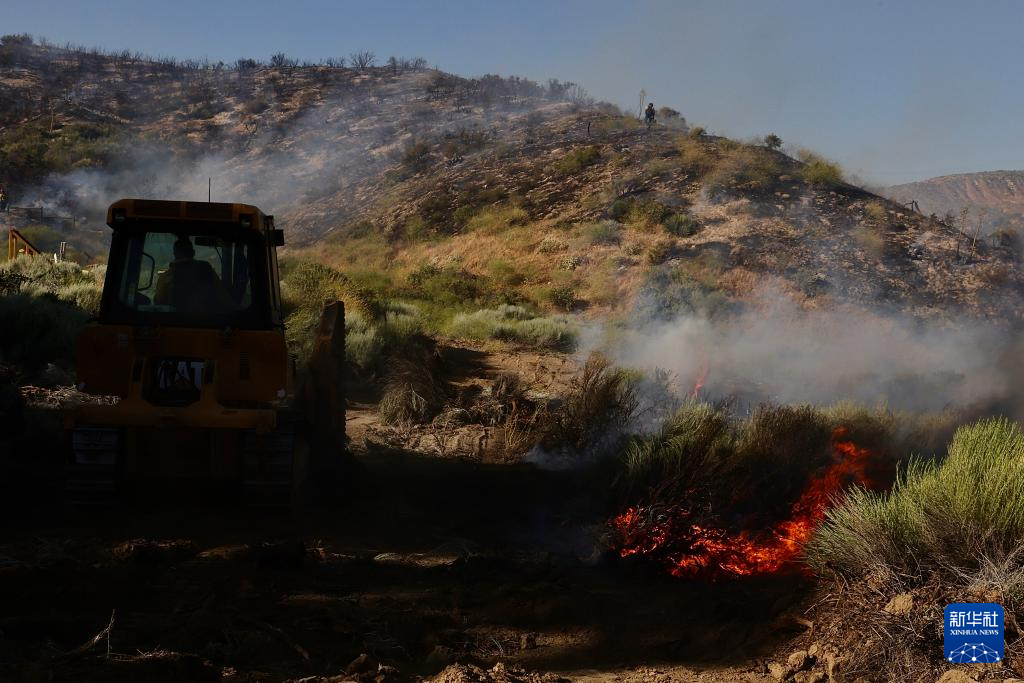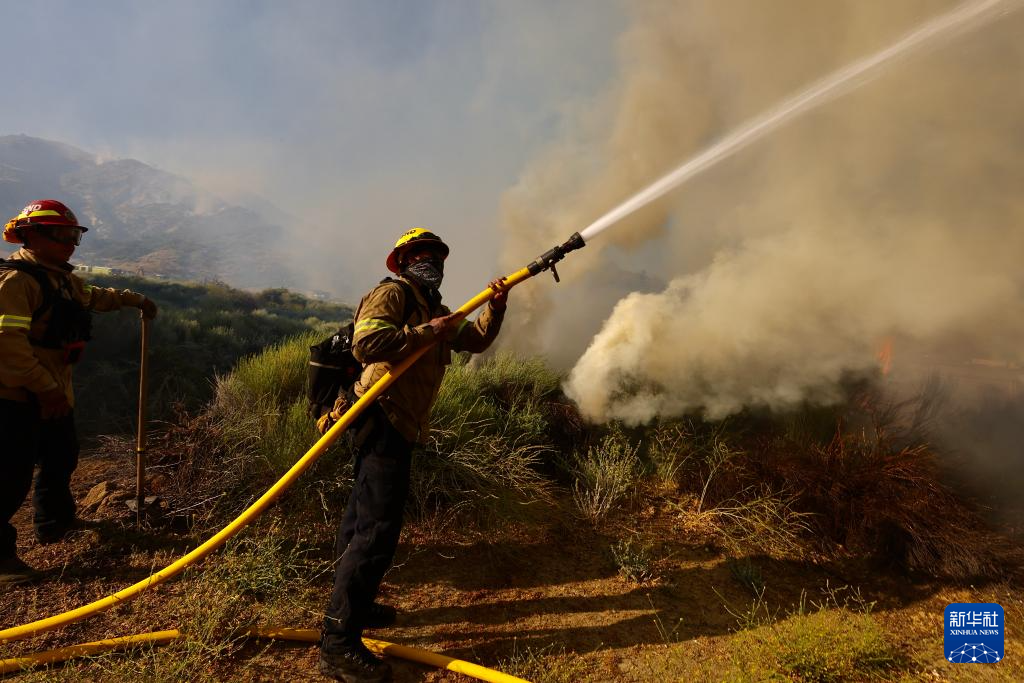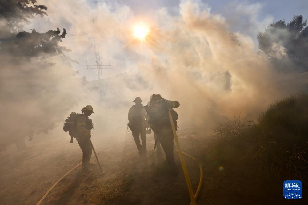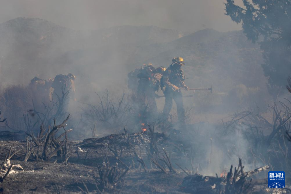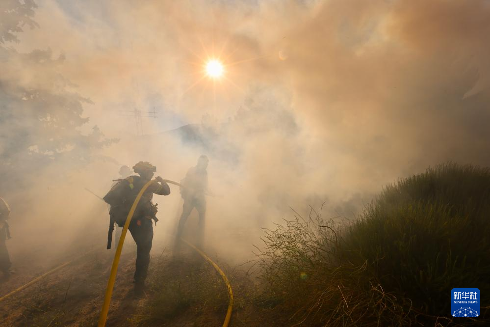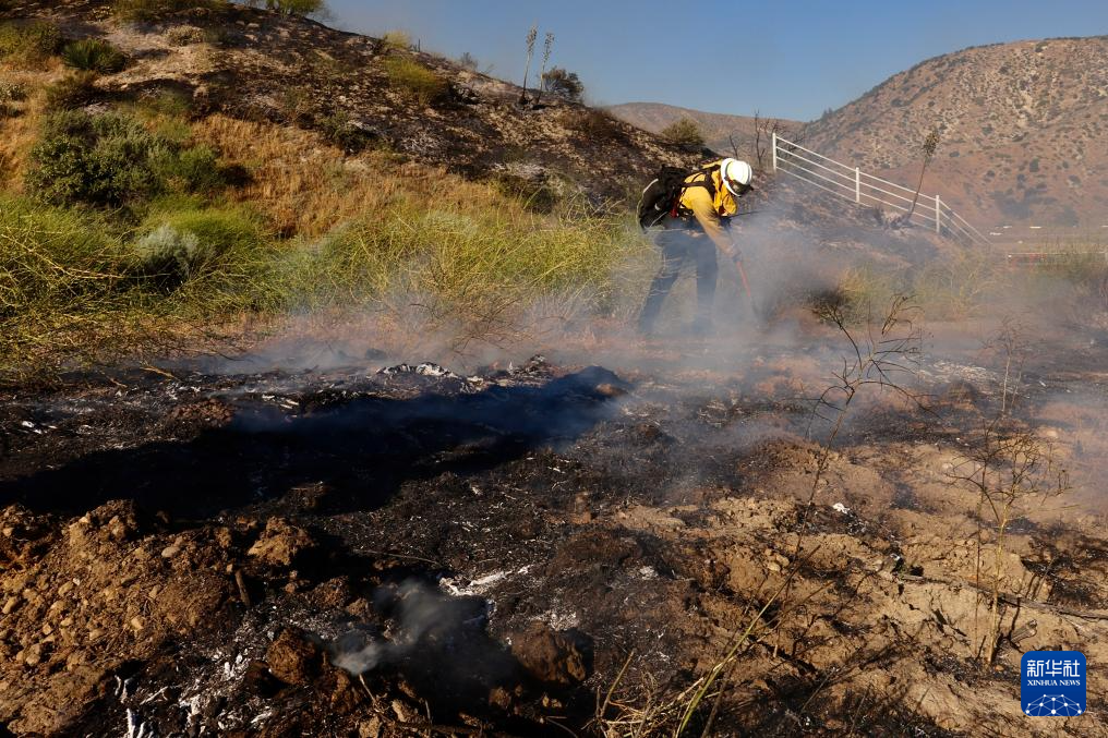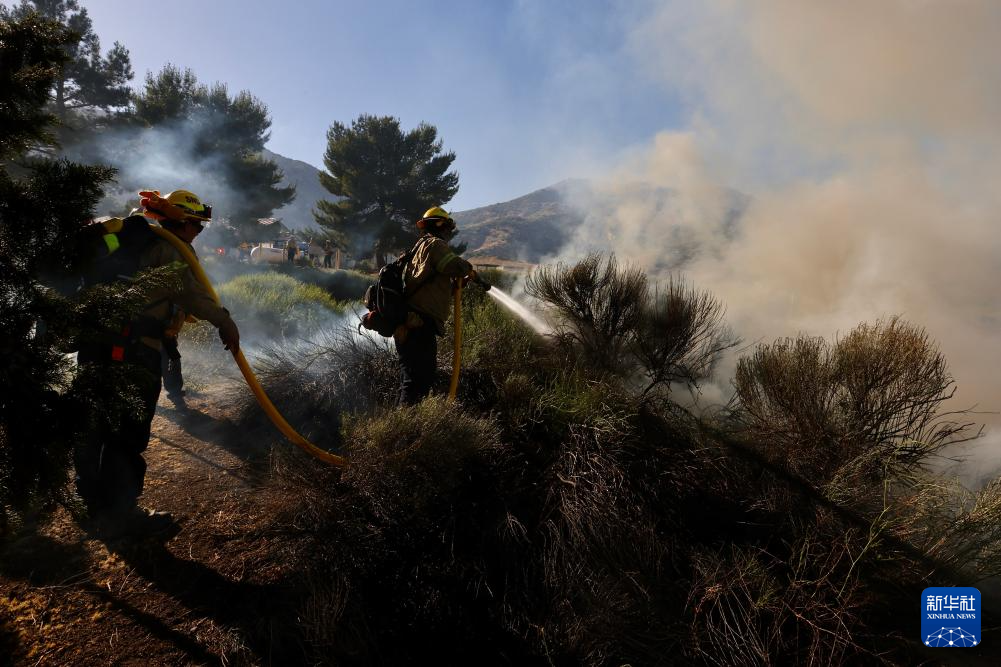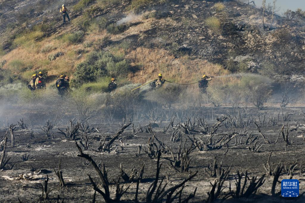 6月16日,消防隊員在美國加利福尼亞州洛杉磯縣西北部的戈曼地區(qū)進行滅火作業(yè)。