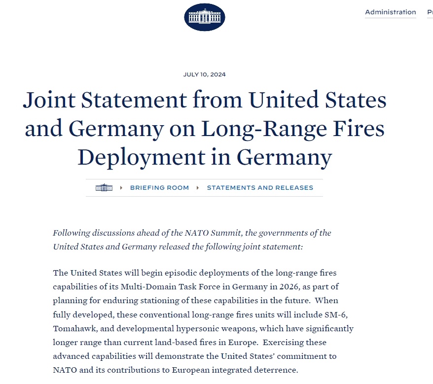 在上周的北約華盛頓峰會期間,美國和德國聯(lián)合宣布,作為長期規(guī)劃的一部分,美國將從2026年開始分階段在德國部署遠程武器。