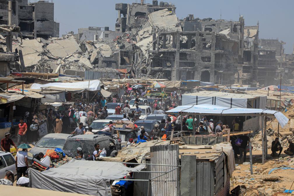 7月22日,在加沙地帶南部城市汗尤尼斯,人們逃離家園。巴勒斯坦加沙地帶衛(wèi)生部門22日說,以色列軍隊當(dāng)天轟炸汗尤尼斯,造成至少70人死亡、超過200人受傷。新華社發(fā)(里澤克·阿卜杜勒賈瓦德攝)