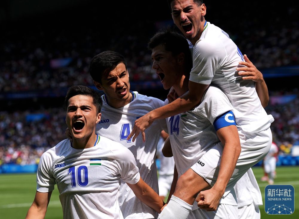 烏茲別克斯坦隊球員在比賽中慶祝進球。新華社記者 李一博 攝