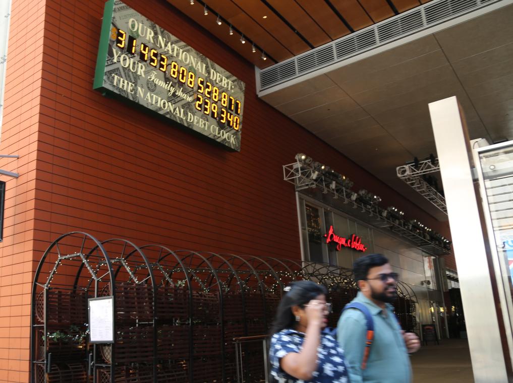 2023年5月29日,人們經過美國紐約曼哈頓的“國債鐘”。“國債鐘”是一個大型計數(shù)器,它實時更新美國的公共債務總額,并顯示出每個美國家庭所要負擔的數(shù)額。 新華社記者劉亞南攝