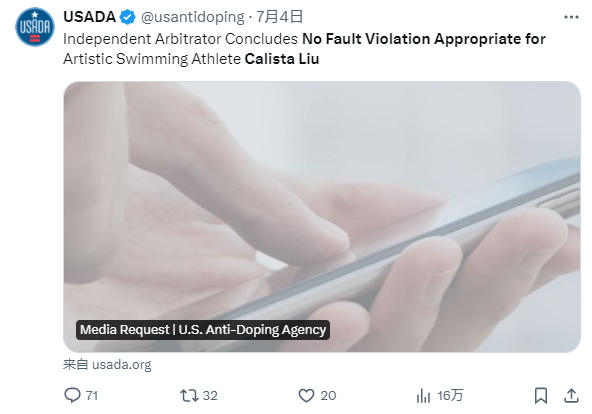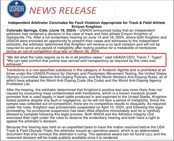 這屆奧運(yùn)會,享受了美國這項“服務(wù)”的除了花游運(yùn)動員卡莉斯塔,還有田徑運(yùn)動員埃里揚(yáng)·奈頓。他們分別在5月和3月藥檢陽性,但巧的是,美國官方對這兩人的脫罪聲明都是卡在奧運(yùn)會前發(fā)出,“及時”地保住了他們的參賽資格,然后美國反興奮劑機(jī)構(gòu)官網(wǎng)又“及時”地把聲明刪掉了。