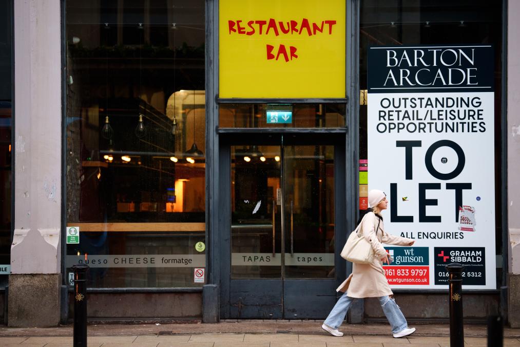 2023年11月22日,一名女子走過(guò)英國(guó)曼徹斯特一家關(guān)閉的餐廳。新華社發(fā)(喬恩·休珀攝)