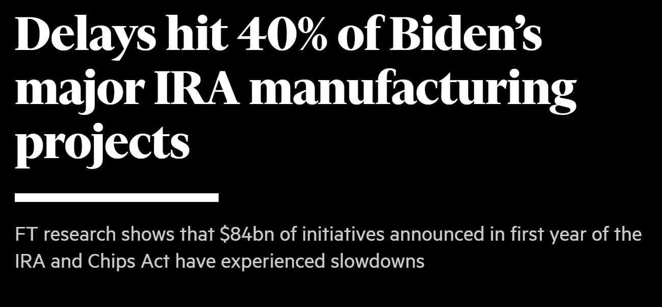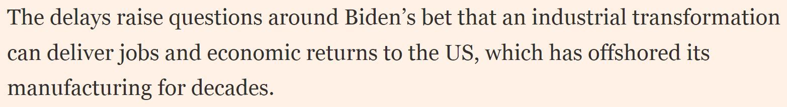 按照《金融時報》的說法,項目遲滯令輿論質(zhì)疑拜登政府所篤定的工業(yè)轉型有望為美國帶來就業(yè)和經(jīng)濟回報的說法。
