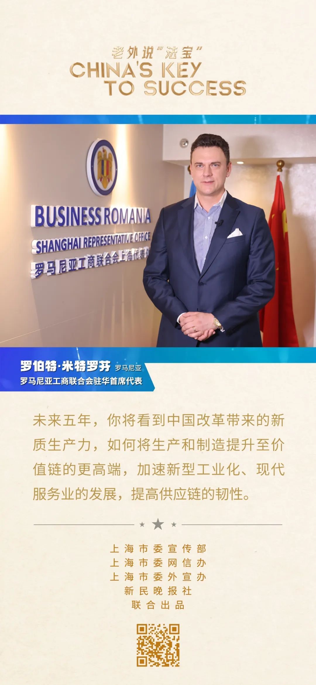 羅伯特·米特羅芬是羅馬尼亞工商聯合會駐華首席代表。2010年,他以羅馬尼亞國家館工作人員的身份來滬參加上海世博會,那次的旅程讓他深深愛上了這座城市。從那時起,他就在上海定居。