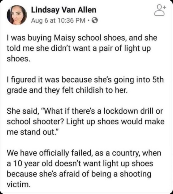 然而,梅茜這樣做的真實原因卻令人十分痛心。林賽寫道:“她說‘如果進(jìn)行封鎖演習(xí)或者發(fā)生校園槍擊事件怎么辦?發(fā)光的鞋子會讓我更引起注意?!边@個孩子非常擔(dān)心發(fā)生校園槍擊事件,以致于她不得不放棄每個孩子都想要的LED發(fā)光鞋。