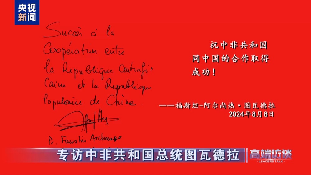 △中非總統(tǒng)圖瓦德拉在接受總臺專訪后題詞