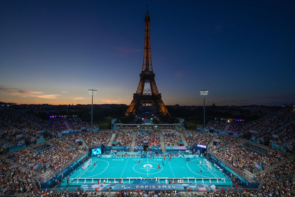 這是9月1日拍攝的巴黎殘奧會(huì)盲人足球比賽現(xiàn)場(chǎng)。新華社記者 熊琦 攝