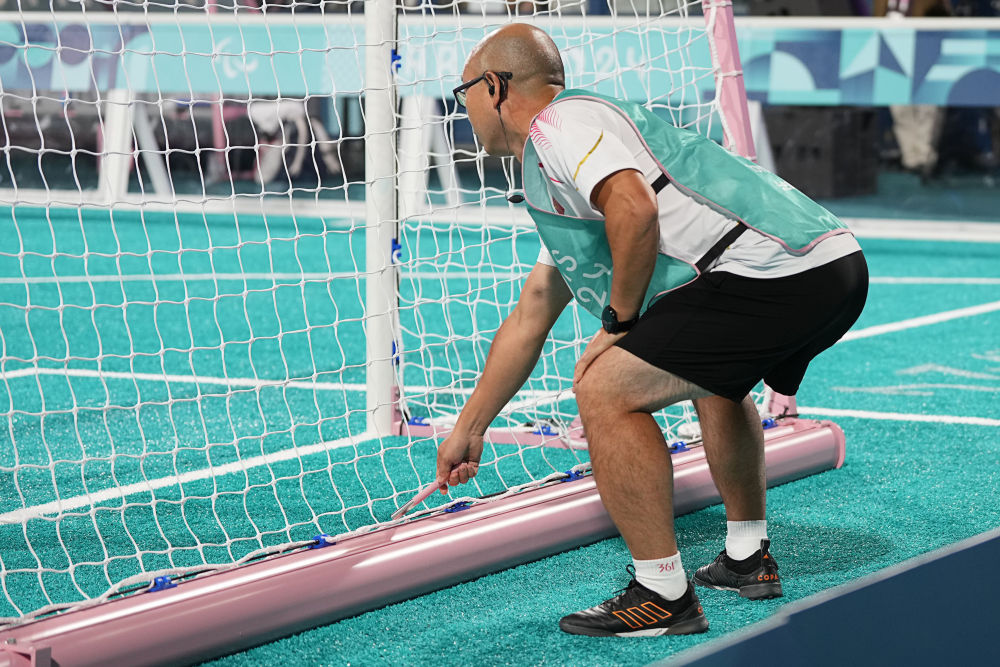 9月1日,中國(guó)隊(duì)引導(dǎo)員李進(jìn)在比賽中用金屬棒敲擊門(mén)框幫助球員定位。新華社記者 熊琦 攝